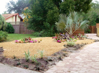 The Landscapes Orlando Florida team just finished a major transformation of a classic "retro" ranch style home with pavers and a rock garden.